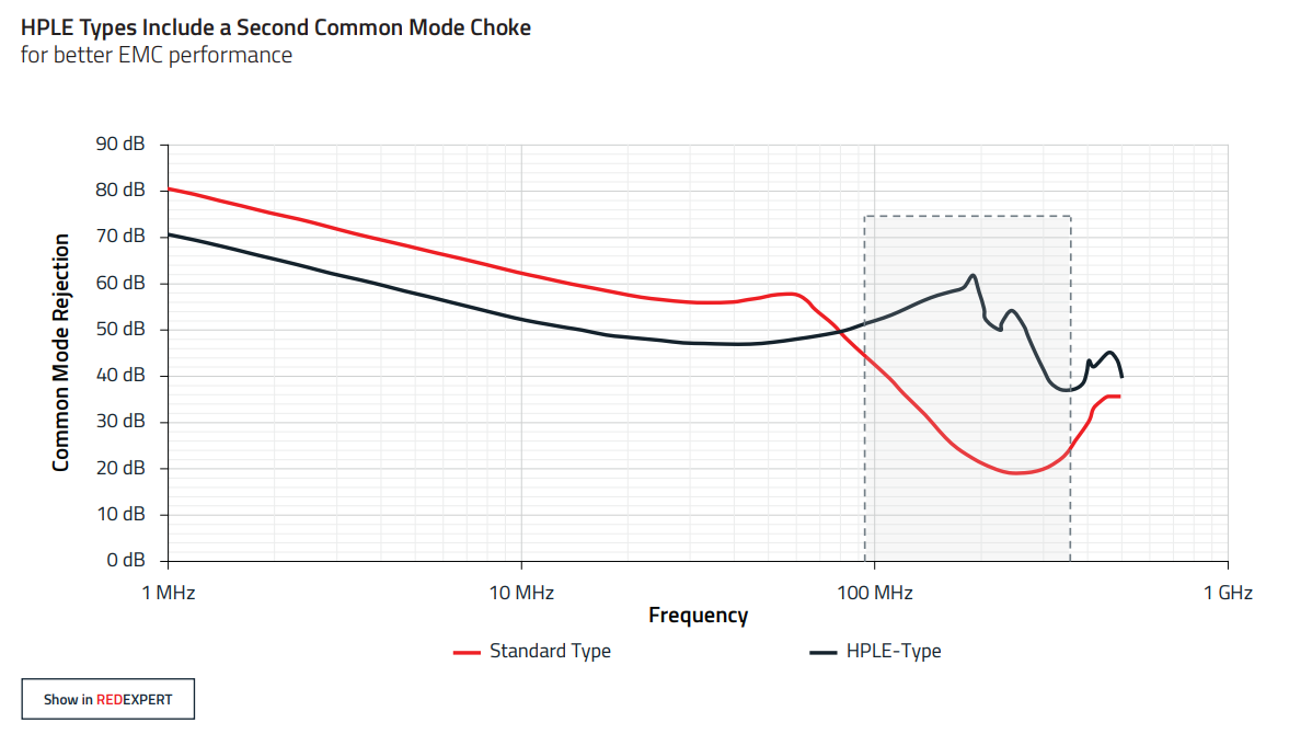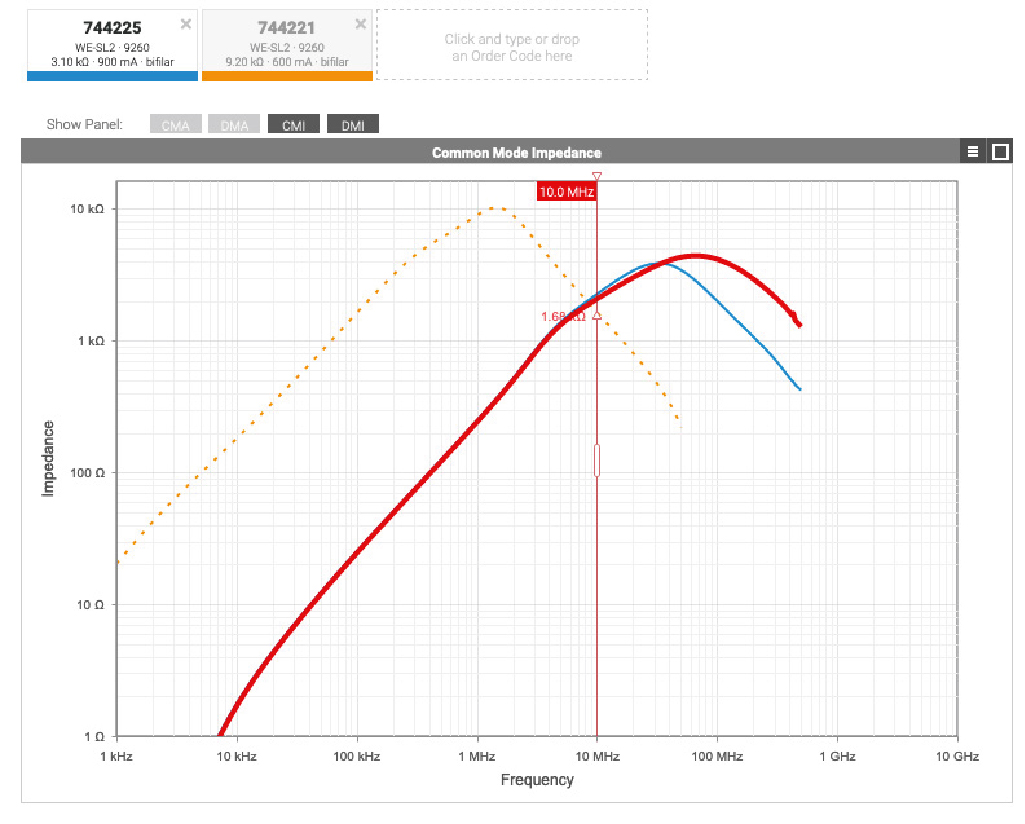 In data lines, common-mode signals can cause interference and affect signal integrity. A common countermeasure is the use of common-mode chokes. To select the appropriate common-mode choke, it is advisable to refer to the impedance curves over frequency instead of just considering inductance. These can be found on the RedExpert online simulation platform by Würth Elektronik.
