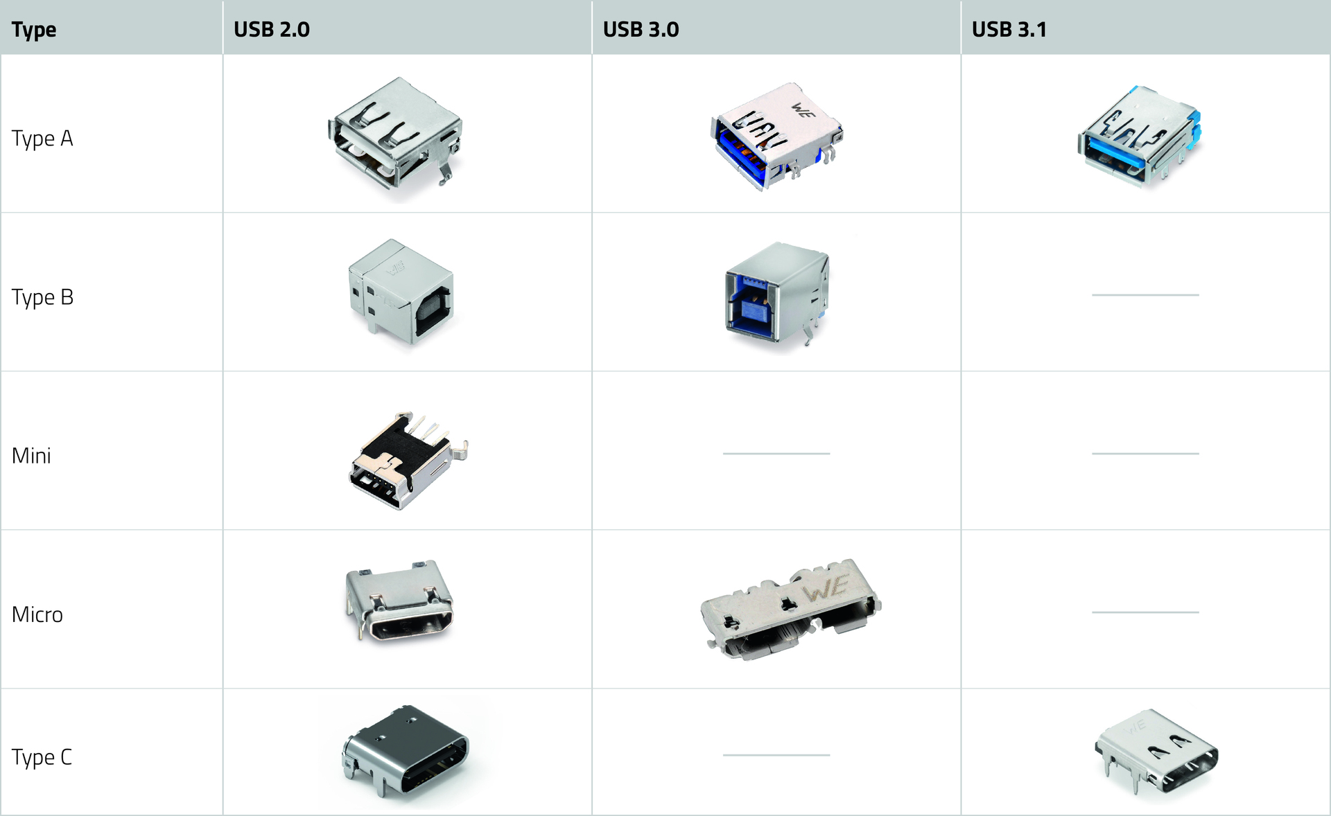 The table shows the variety of USB connectors. While there were still five different types in use for the USB 2.0 standard, the types have consolidated to only two for the USB 3.1 standard. The EU regulation requiring new devices to use USB-C as the charging standard is likely to have further accelerated this consolidation.