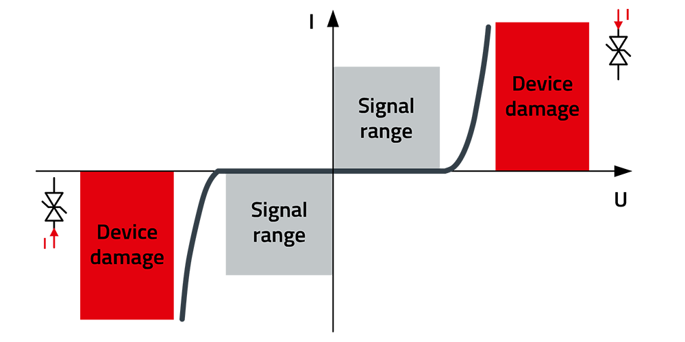 Characteristic curve for a bidirectional overvoltage protection element: Under normal operation, the signal should remain within one of the gray shaded voltage areas. If the voltage continues to increase (in either a positive or negative direction), excess currents are initially diverted and the voltage is clamped, before reaching the red area at even higher overloads, where the overvoltage protection element may become damaged.