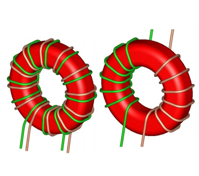 For DC filters, common mode chokes with bifilar (see left) or sectional (see right) winding are available. Due to the additional differential mode attenuation, the sectional winding is recommended for DC lines.
