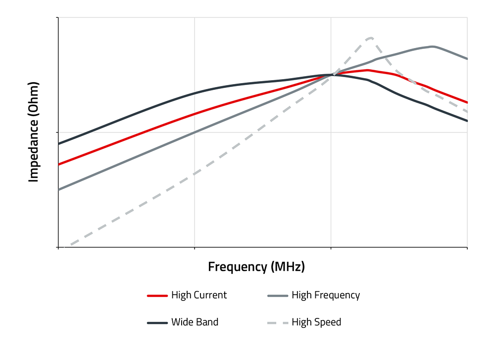 SMT ferrites can be characterized according to four application areas: 1) high currents, 2) high frequencies, 3) wide bandwidth, and 4) high speed. The diagram shows the impedance characteristics as a function of frequency for the four application areas.