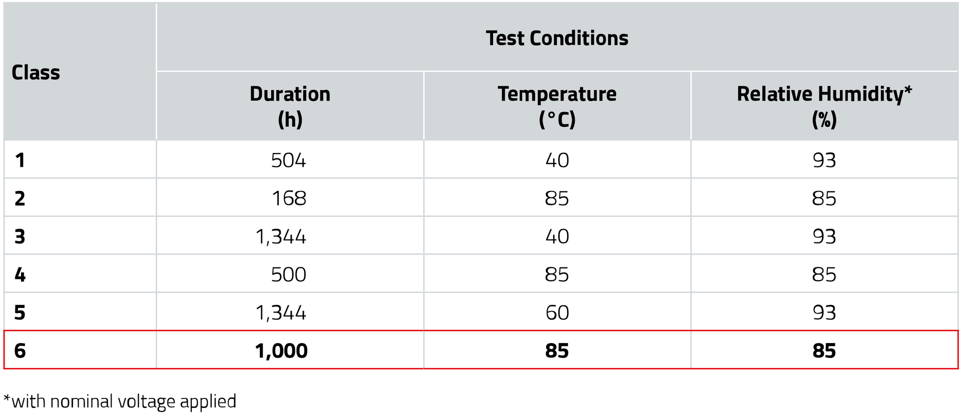 Harsh environments with high temperatures and high humidity can degrade the dielectric layers in capacitors, thereby reducing their capacitance. The table shows the test classes from 1 to 6 and under which conditions - duration, temperature, and relative humidity - the capacitors were tested at nominal voltage.