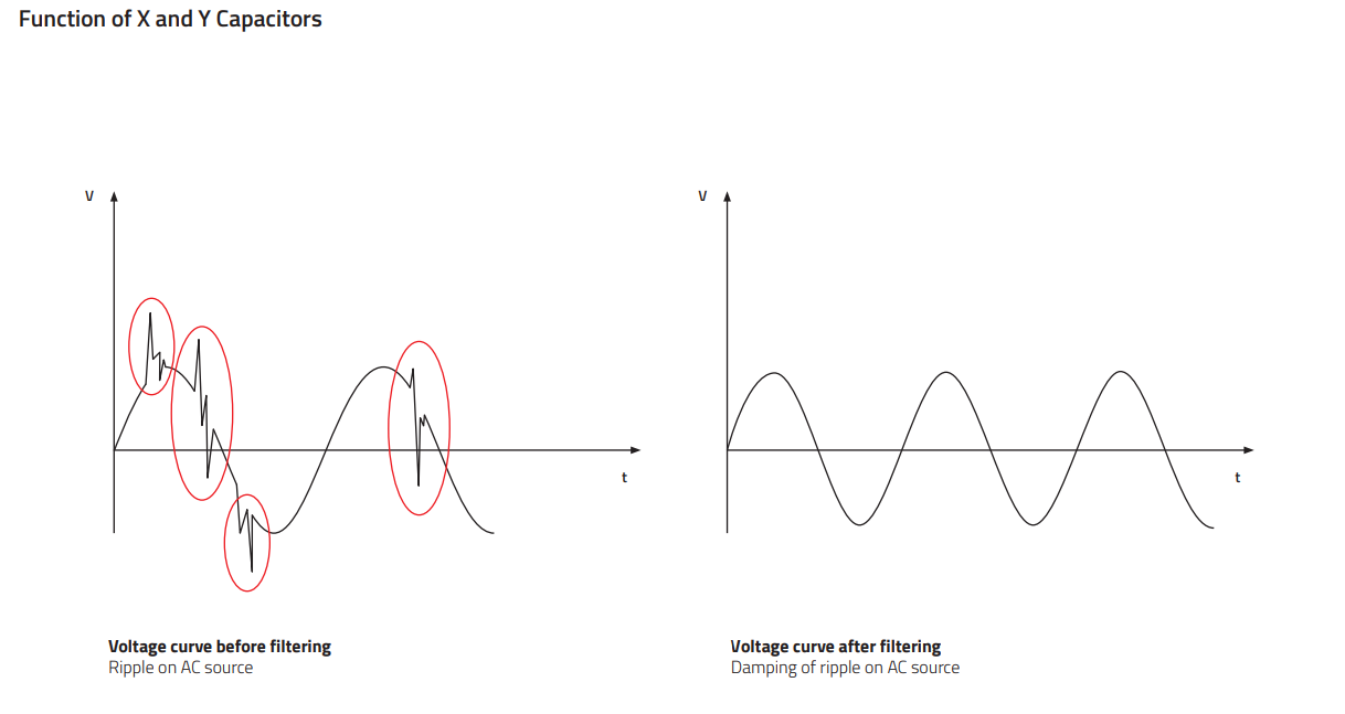 In the suppression of EMI noise signals, capacitors are used as so-called X and Y capacitors. On the left side of the image, voltage ripples from the AC power source are visible, which prevent a clean signal waveform. On the right, a clean sine wave is shown, which has been smoothed after filtering the voltage ripples of the AC power source with interference suppression capacitors.