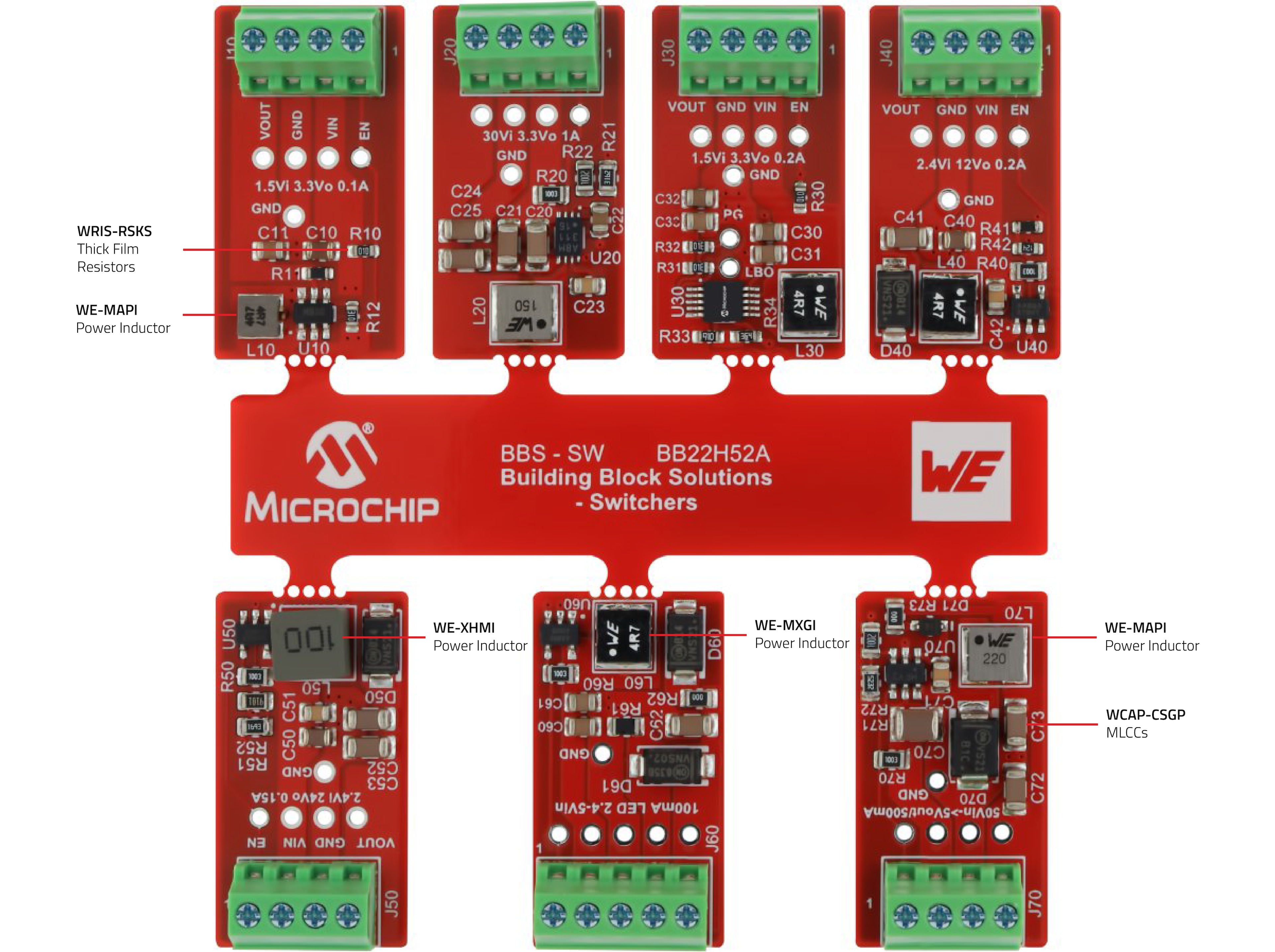 The Building Block Solutions – Switchers (BBS-SW) board is a modular demonstration platform designed to evaluate and demonstrate the features of several Microchip Technology monolithic DC-DC switching regulators. The board consists of seven independent sub-modules, each featuring a different DC-DC converter, allowing users to easily test, compare, and integrate these solutions into their own designs.