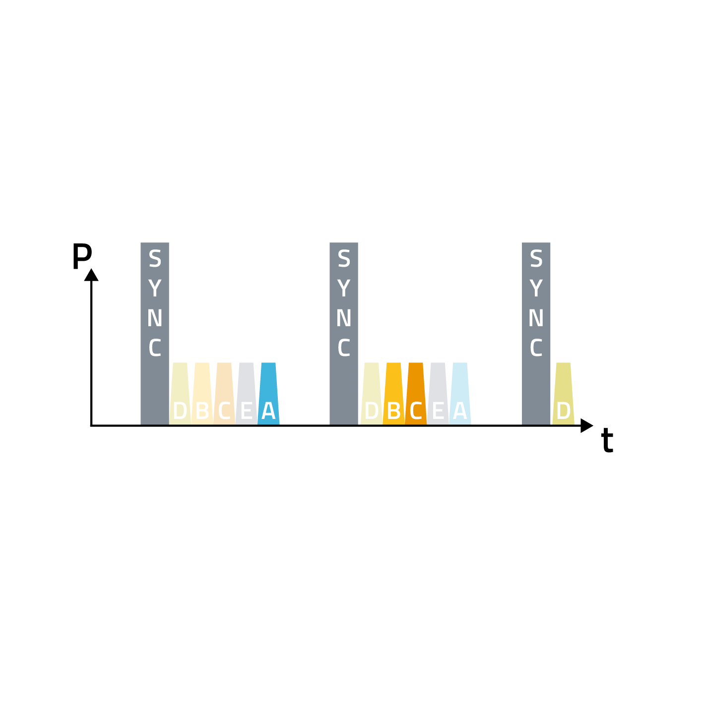 All nodes are synchronized and transmit/receive at determined time slots.