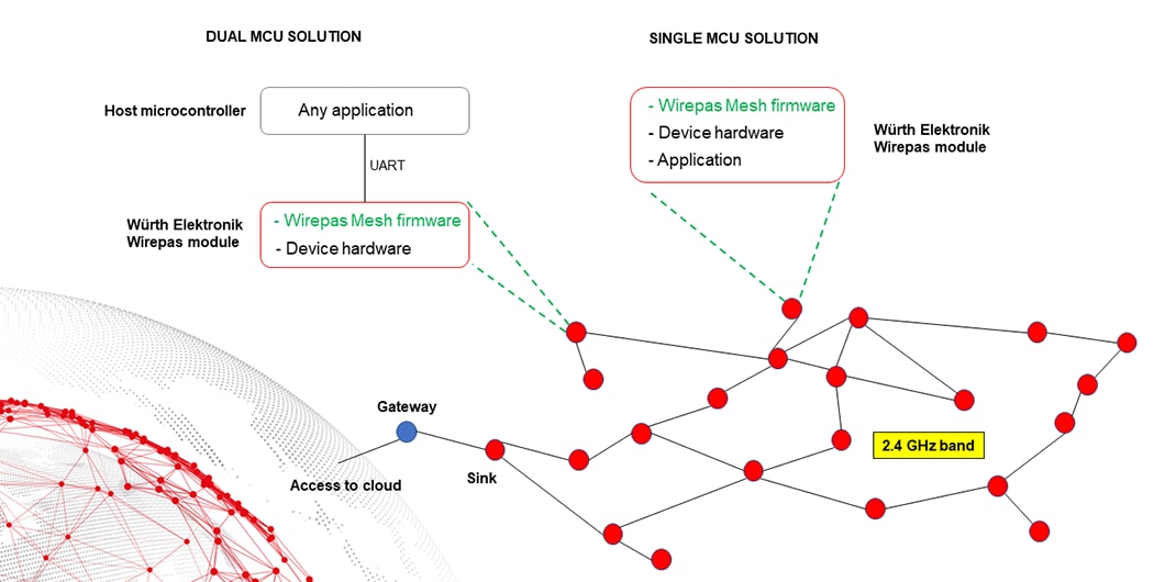 Wirepas is specialized in IoT topics and offers the Wirepas Mesh stack (firmware only) and support to high volume customers. Würth Elektronik is in cooperation with Wirepas to integrate the Wirepas mesh stack into radio chips as well as offering service to our customers to develop Wirepas mesh radio modules based on the existing Nordic Semiconductor nRF platform.