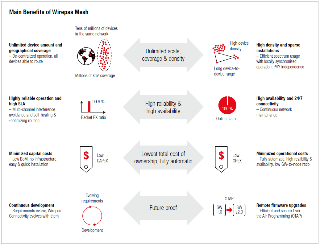 has a high configurability, interference-tolerance, ultra-low energy consumption: Wirepas mesh software is ideal for large scale and battery-operated networks.