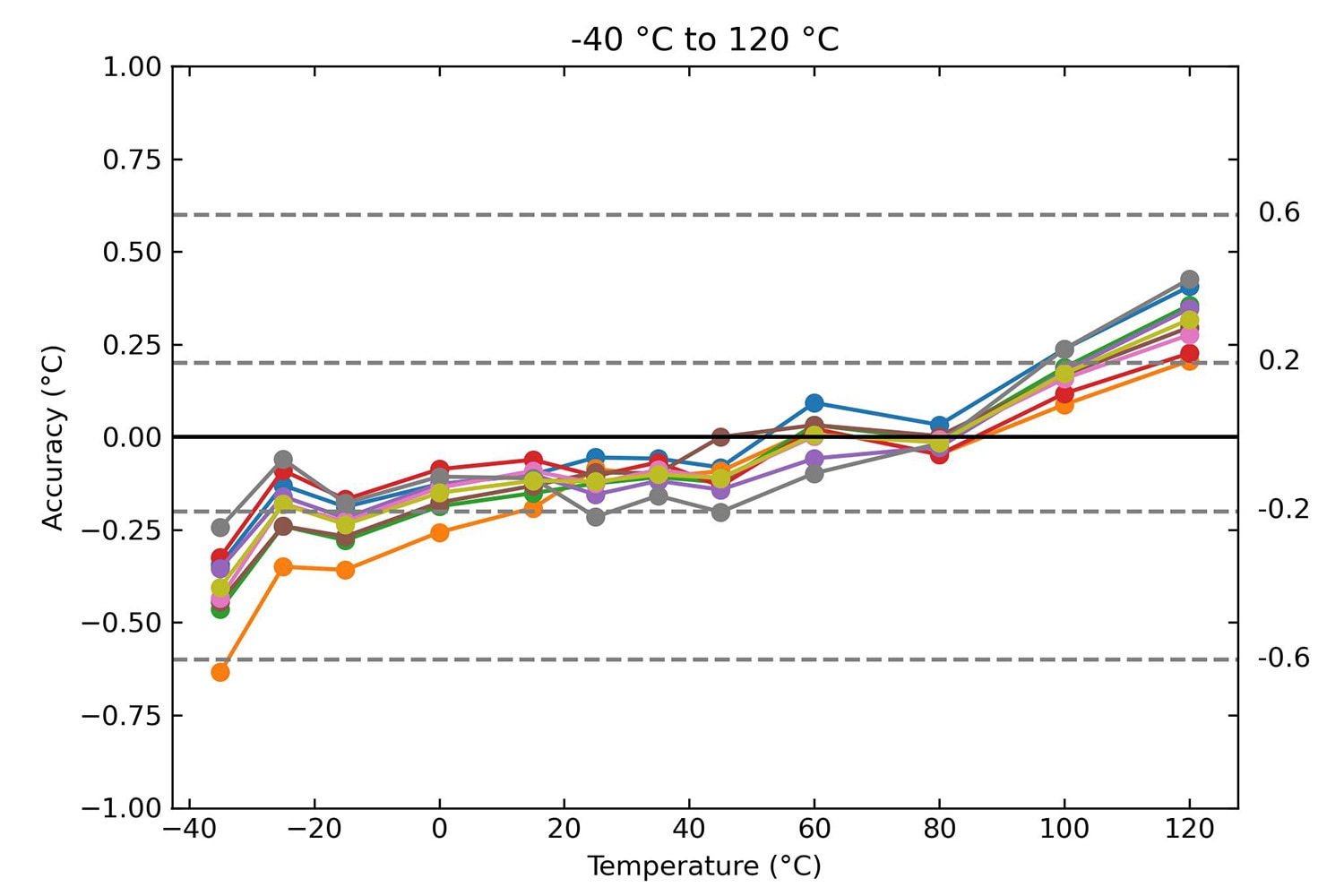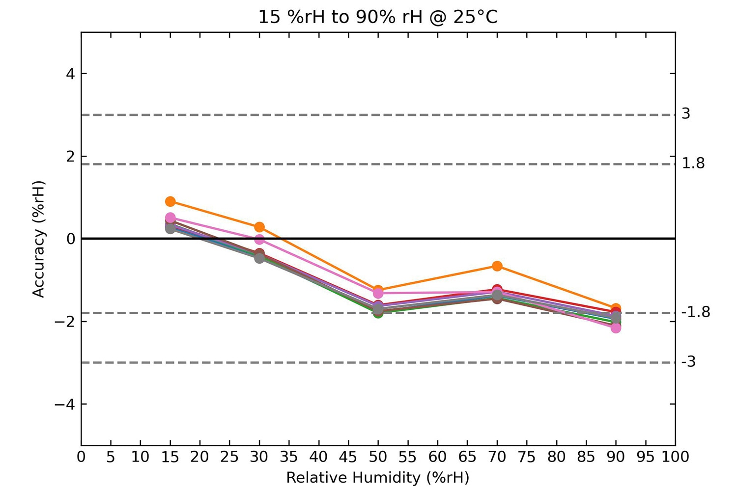 - Humidity accuracy: ±1.8% rH, 20 to 80% relative humidity