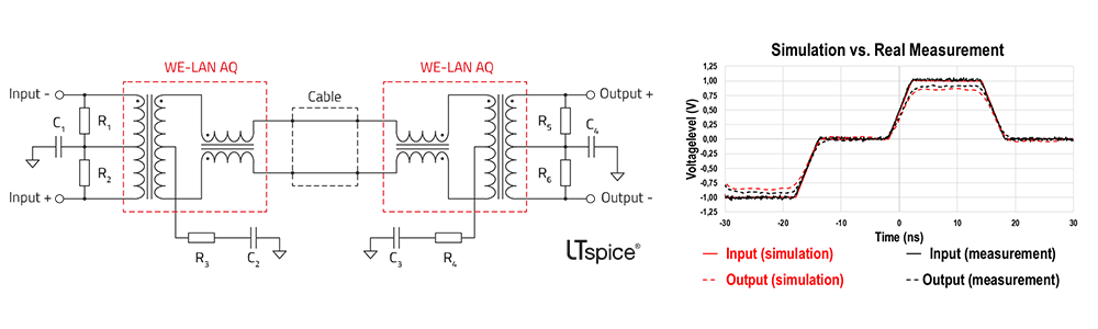 Many applications require galvanic isolation in the signal transmission path, such as LAN connections (Ethernet). Signal transformers like the WE-LAN AQ fulfill this task. To validate the transmission path, it can be simulated with LTspice. The diagram on the right confirms the high accuracy of the simulation based on measurements.