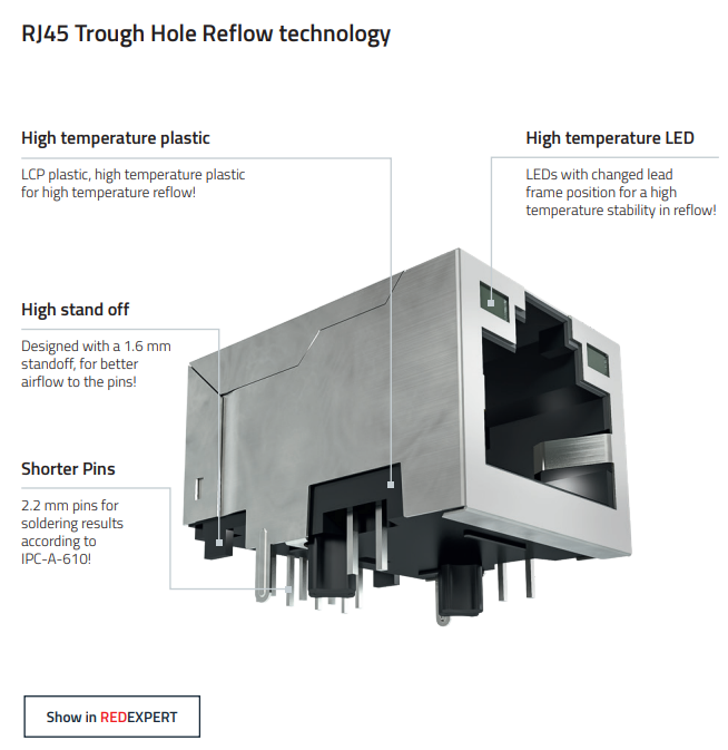 The RJ45 LAN sockets with through-hole technology (THT) for printed circuit boards offer increased robustness and mechanical stability. The plastic used, as well as the LEDs with a modified lead frame position, can withstand the higher temperatures of a reflow soldering process. An optimized housing design allows for a uniform reflow air flow to the pins.