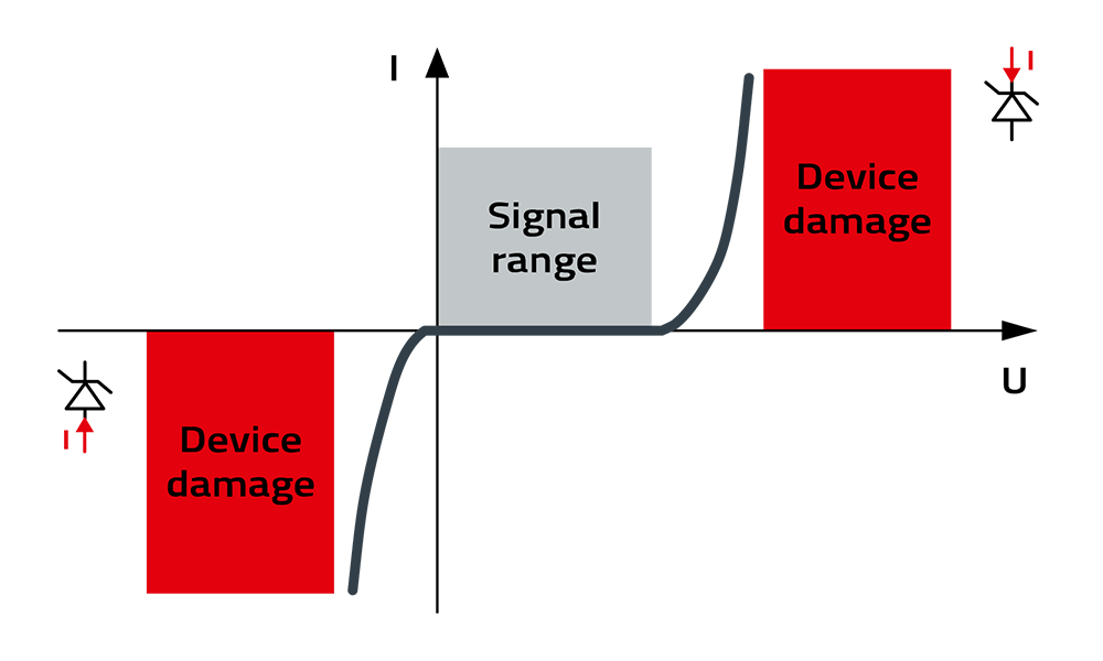 Characteristic curve for a bidirectional overvoltage protection element: Under normal operation, the signal should remain within one of the gray shaded voltage areas. If the voltage continues to increase (in either a positive or negative direction), excess currents are initially diverted and the voltage is clamped, before reaching the red area at even higher overloads, where the overvoltage protection element may become damaged.