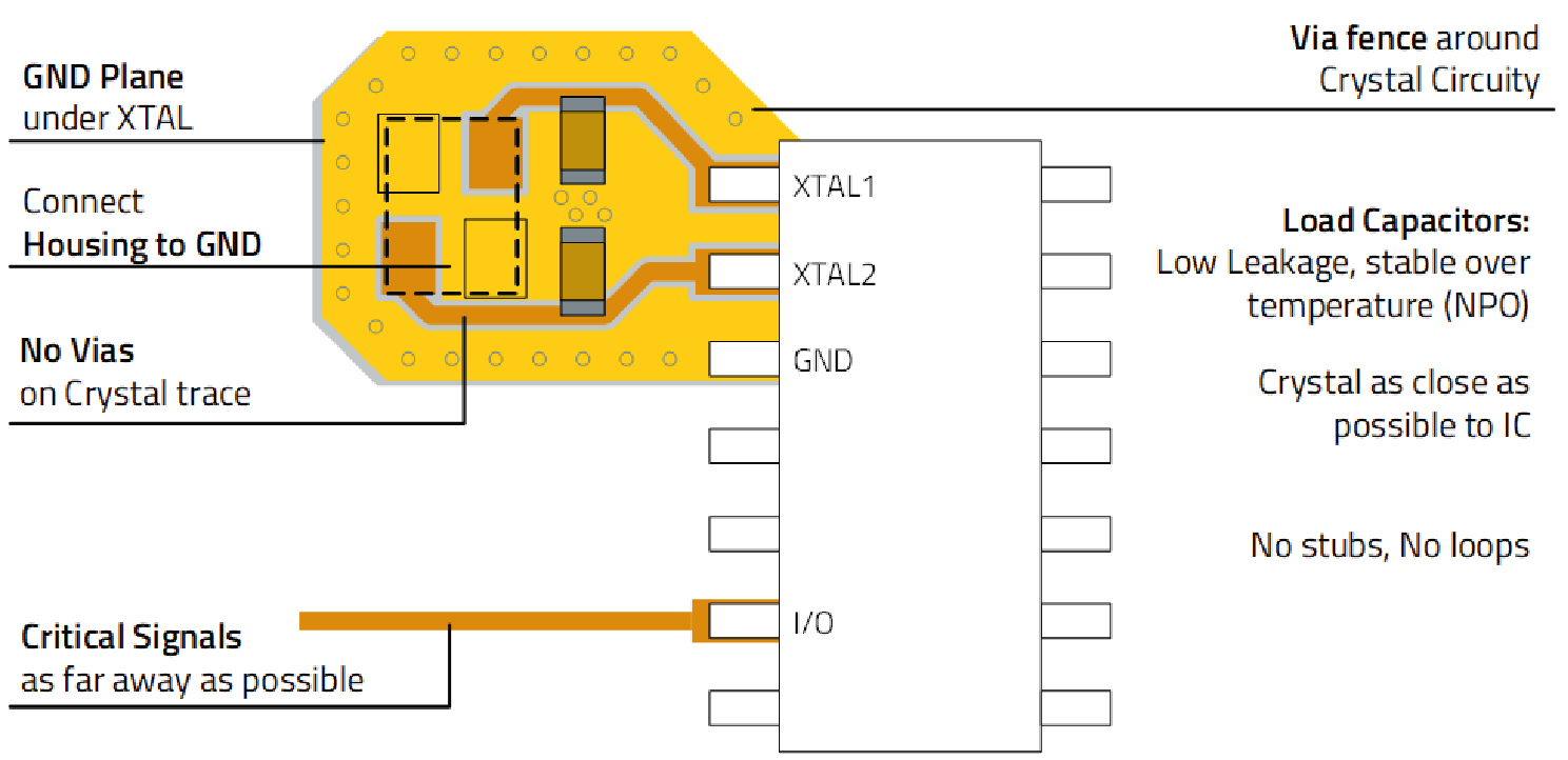 Keep the XTAL as close as possible to the IC. Where applicable connect the XTAL housing to GND. A via fence reduces coupling to the GND plane. An oscillator can be used alternatively.