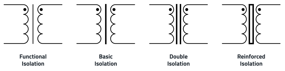 In offline transformers for power supplies, there are different classes of insulation: - Functional insulation does not provide protection but avoids ground loops and short circuits. - Basic insulation is not considered safe on its own but offers a protective layer and functional insulation. - Double insulation is considered safe and provides functional insulation with two protective layers. - Reinforced insulation is considered safe and offers a protective layer without a single point of failure.
